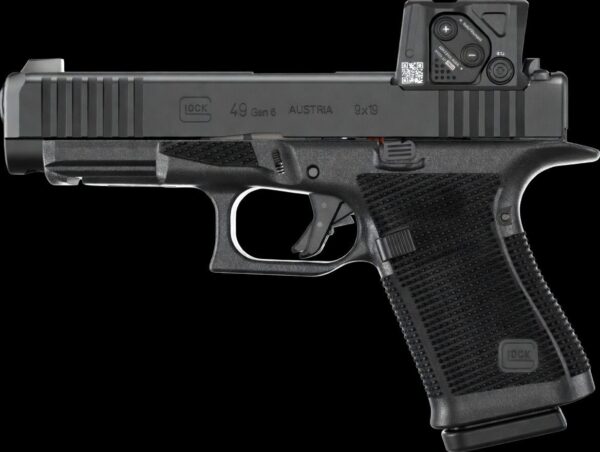 Glock 49 Gen6 A-CUT je CROSSOVER pištoľ v kalibri 9 mm Luger v konfigurácii s kolimátorom Aimpoint COA, s záverom a modulárnym optickým systémom navrhnutým pre kolimátor Aimpoint COA.